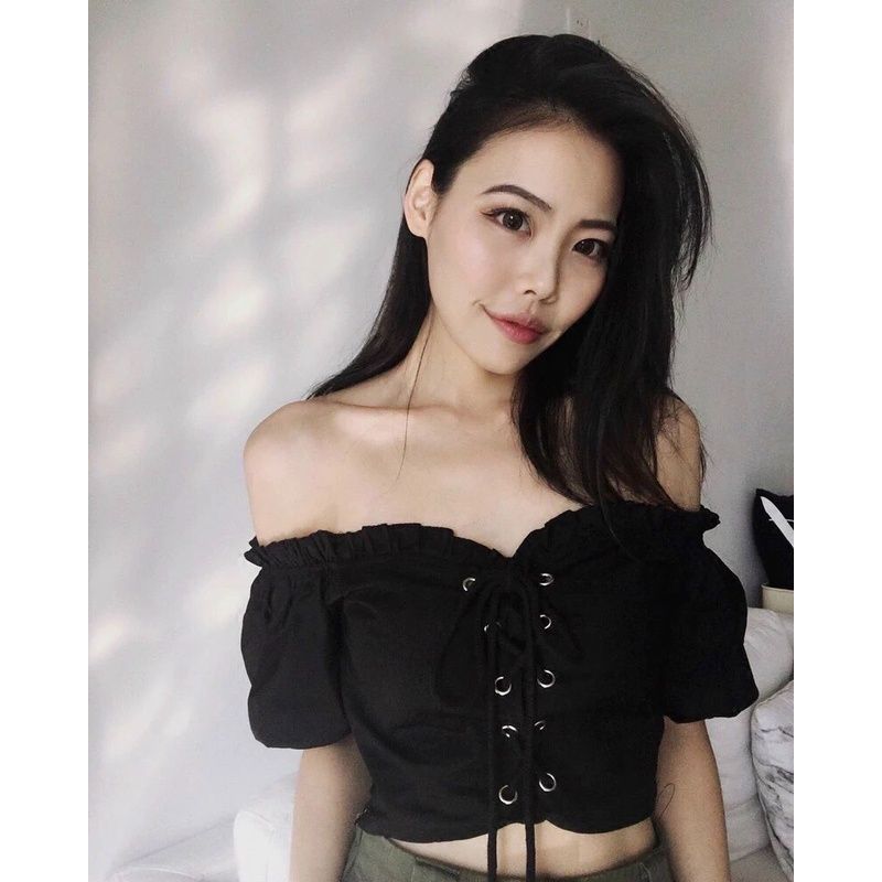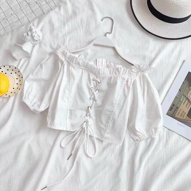 Áo bẹt vai thiết kế xỏ dây dễ thương cho nữ, chất kate dày, Freesize, hot 2023